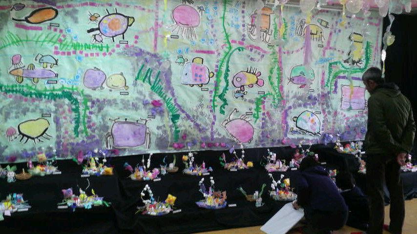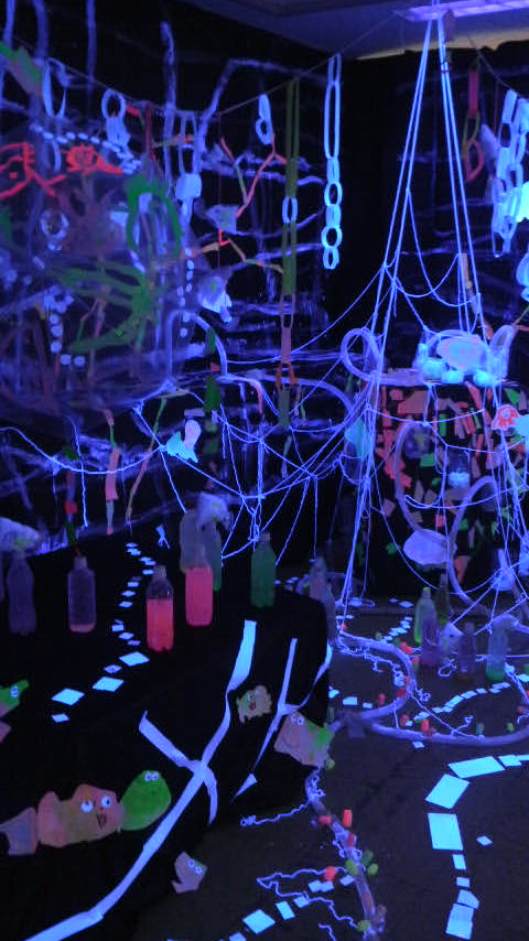 蛍光塗料で作品に色を塗り、海の底をイメージしてる展示教室に思わず微笑んでしまいました。